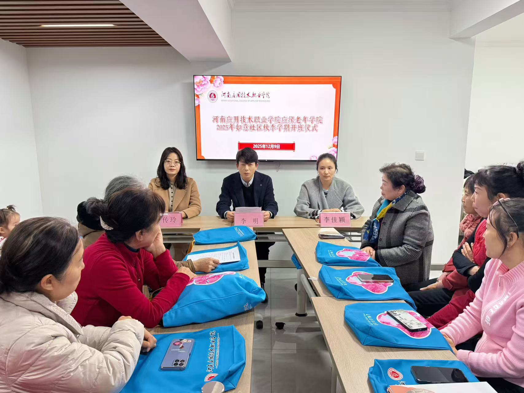 12月9日,河南应用技术职业学院应缘老年学院开班仪式在如意社区党群服务中心隆重举行。桐柏路街道如意社区居委会书记李佳颖、河南应用技术职业学院继续教育学院院长李明、河南应用技术职业学院继续教育学院副院长冯传玲等领导出席,老年学院相关负责人、全体学员及学生代表齐聚一堂,共同见证这一助力老年群体“老有所学、老有所乐”的重要时刻。